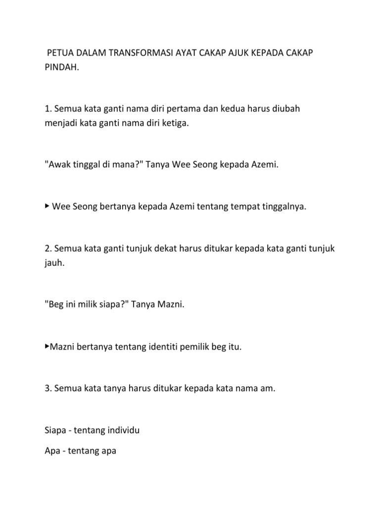 0 Petua Dalam Transformasi Ayat Cakap Ajuk Kepada Cakap Pindah Pdf
